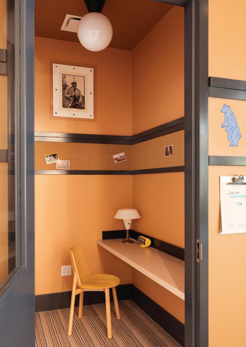 Charles used shades of terra-cotta in the workspaces; purples, blacks, pinks and yellows in the social hall (as a nod to Mardi Gras); and tone-on-tone greens in the green room.