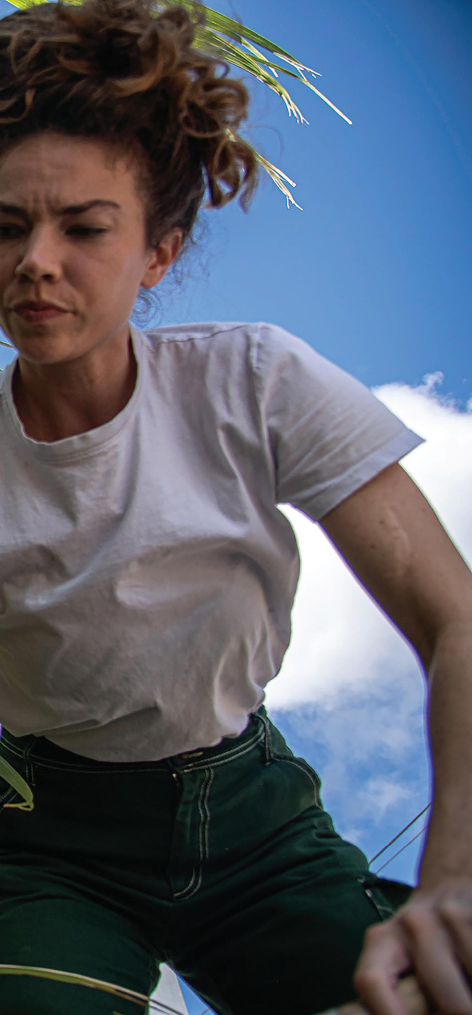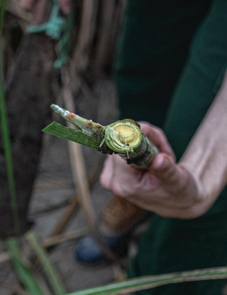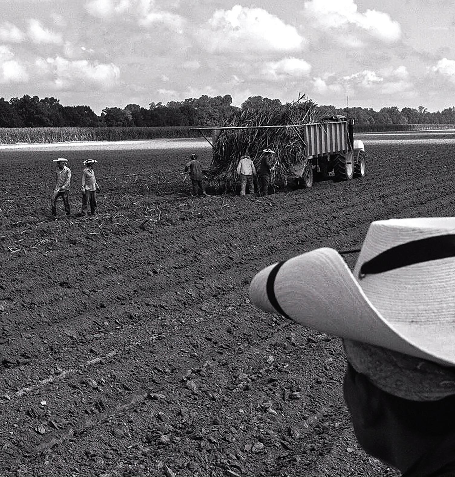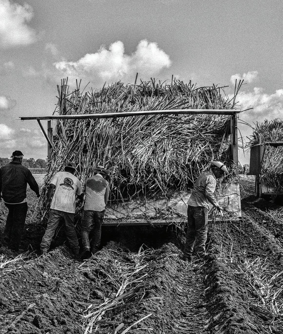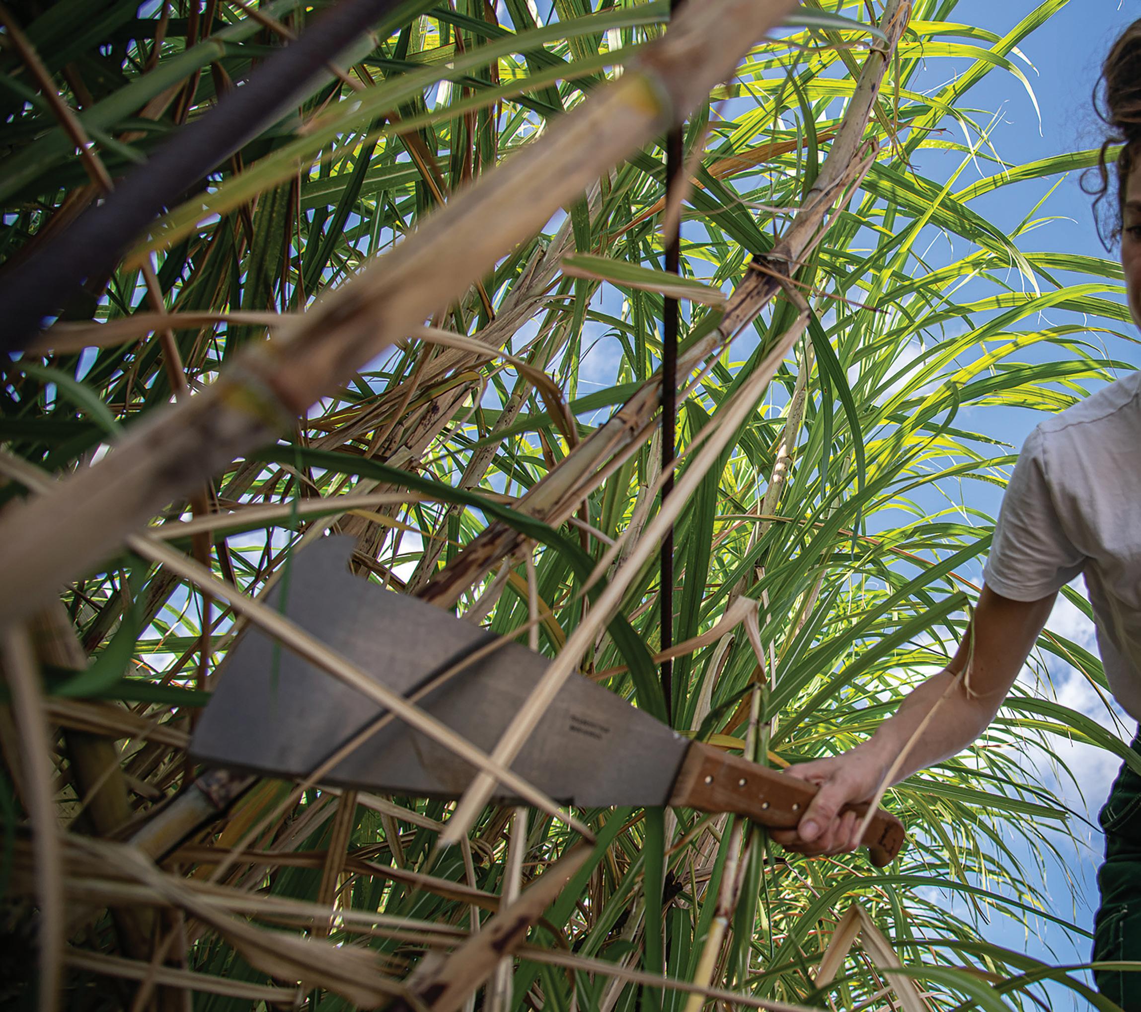 (Above) Olivia Stewart cuts cane outside of Oxbow Rum Distillery. (Right) Stewart displays the growing point near the top of a cane stalk. (Opposite) A laborer oversees sugarcane planting in Pointe Coupée Parish.