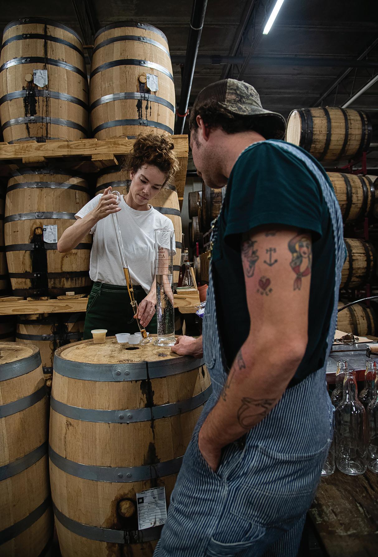 (Left) Stewart examines a sample of massecuite, a dense mass of sugar crystals mixed with mother liquor obtained by evaporation. (Above) Revel Griffith and Stewart “thieve” from a barrel to determine how the aging process is influencing the spirit.