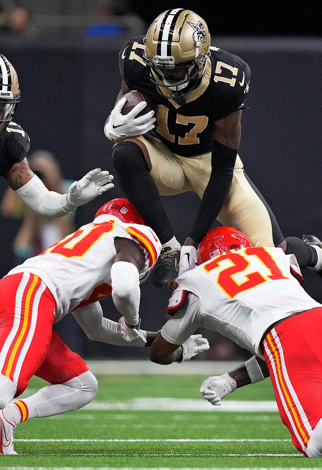 2022 Season Final Statistics RECEIVING NO. YDS. AVG. LONG TD Olave 72 1042 14.5 53t 4 Kamara 57 490 8.6 54 2 J. Johnson 42 508 12.1 41t 7 Shaheed 28 488 17.4 68t 2 Landry 25 272 10.9 40 1 Benjamin TM 1 9 9.0 9 0 T. Smith 19 278 14.6 48 1 Trautman 18 207 11.5 22t 1 Thomas 16 171 10.7 21 3 Callaway 16 158 9.9 33 1 Ingram 16 68 4.3 11 0 Hill 9 77 8.6 30t 2 D. Johnson 4 47 11.8 21 0 Prentice 3 9 3.0 4 0 White 2 74 37.0 64 0 Kirkwood 2 18 9.0 14 0 Harty 2 13 6.5 9 0 Vannett TM 2 13 6.5 8 0 Jones TM 2 12 6.0 7 0 Murray TM 1 8 8.0 8 0 Washington 1 7 7.0 7 0 TEAM 338 3969 11.7 68t 24 OPPONENTS 322 3413 10.6 78t 17 Date W/L Score Opponent