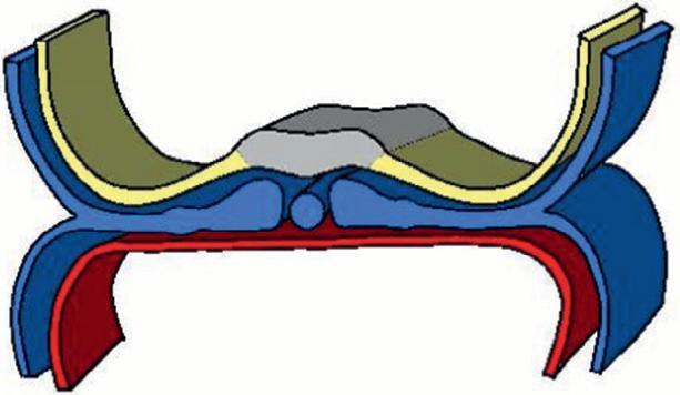 Le mésoblaste (bleu) mis en place lors de la gastrulation se divise en mésoblaste axial (à l'origine de la chorde), en mésoblaste para-axial, en mésoblaste intermédiaire et en les lames latérales (figure 1.19).