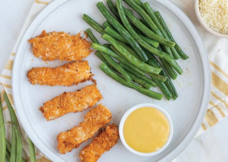 Divide chicken tenders and green beans between plates. Serve with dressing for dipping.