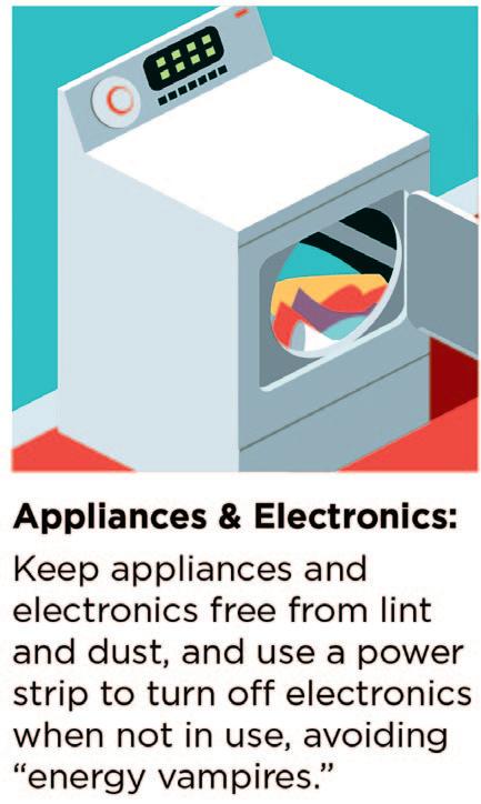 • Cleaning lint traps on dryers and not over drying clothes will save energy and extend the life of your clothes.