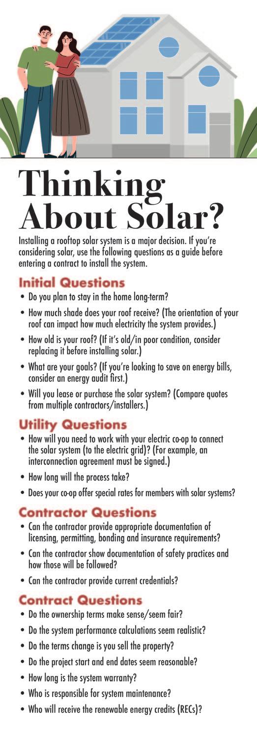 Installing solar is a major decision. You need a reputable energy partner to help you decide. Remember to contact your electric cooperative first. They’re ready to answer your questions and help you make an informed decision.