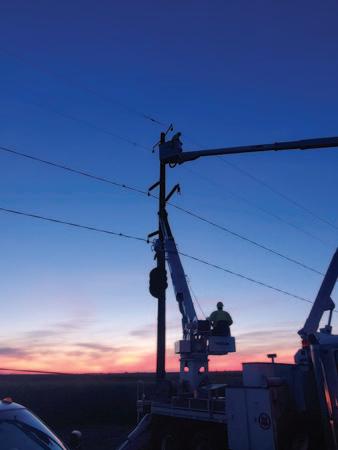 A crew from Southern Public Power District rebuilds a distribution line along a rural road. Photograph by John Gits, Southern PPD Journeyman Lineman