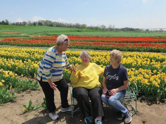Left: A number of park benches provide seating throughout the gardens. Visiting on one of them, with a some of the Farm’s 400,000 tulips as a backdrop are, from the left, LaVonne Johnson of Wisner, Janice Nellor and Cheryl Johnson, both of Beemer.