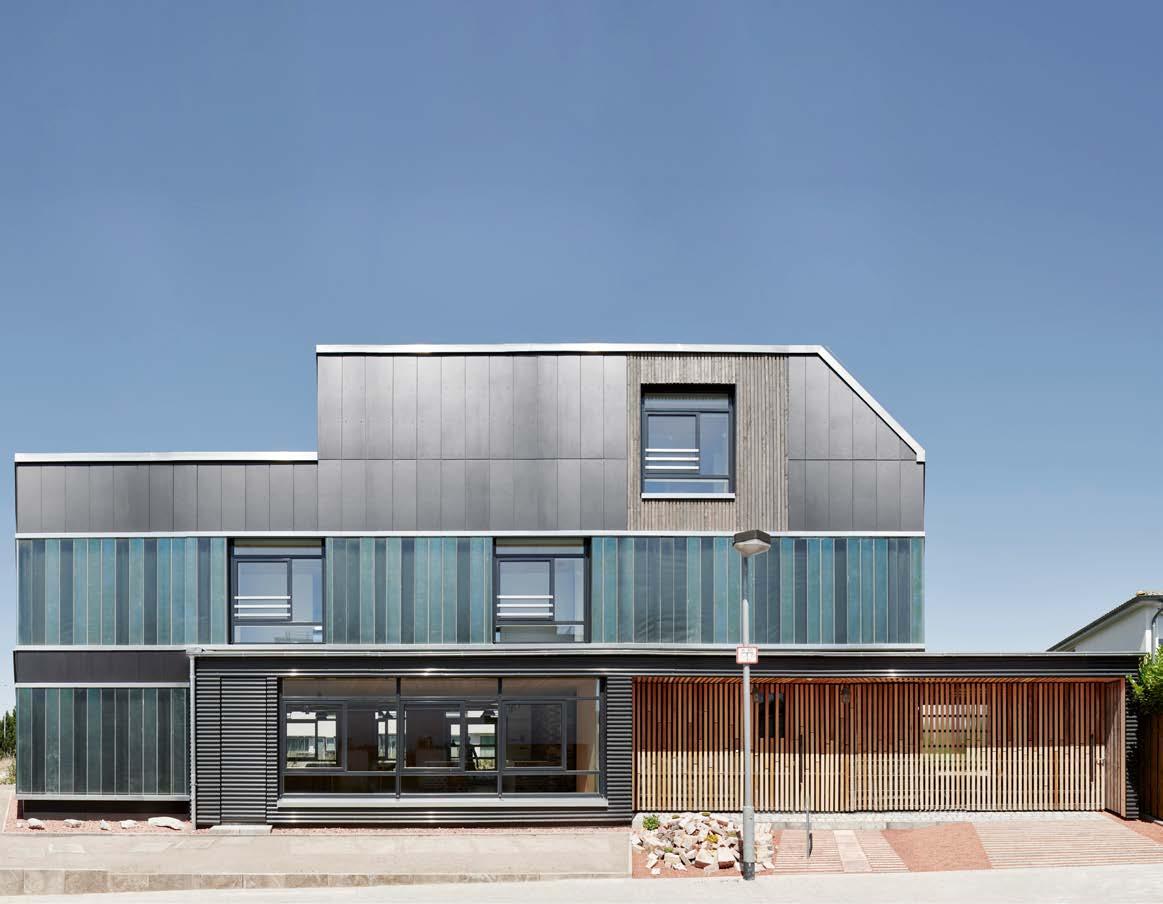 Dorothee Dietrich stellte sich ein Gebäude vor, das in jeder Hinsicht ein Ausrufezeichen setzt: in der architektonischen Erscheinung, in der wohnlichen Atmosphäre und besonders auch in der energetischen Bilanz. So war für sie beispielsweise die eher kostspielige Idee, die Fassade aus Fotovoltaikmodulen zu gestalten, ein klares Go. Die Module verhelfen dem Gebäude nicht nur zu wertvollen Minergie-P-Punkten, sondern auch zu einem aussergewöhnlich futuristischen Look in glänzendem Blaugrau.