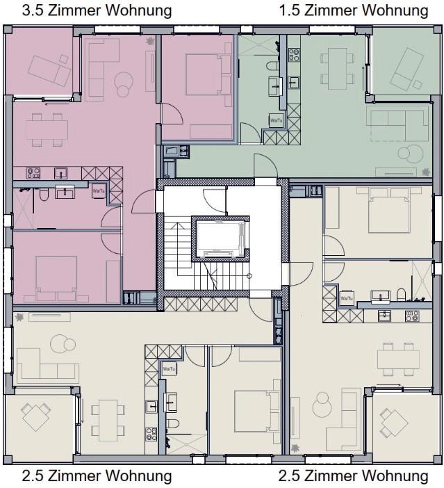 DREI WOHNUNGSTYPEN. Architektonisch flexibles Tetris-Spiel dank kompakter Bauweise.