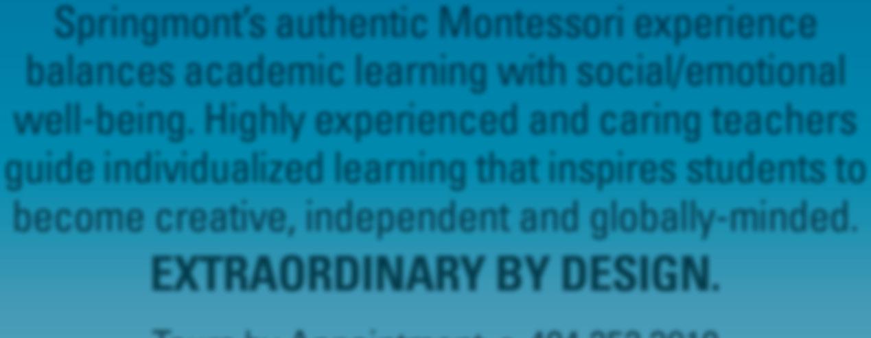 JANUARY 2023 | 33 ATLANTA’S FIRST MONTESSORI SCHOOL 18 MONTHS – 8TH GRADE Springmont’s authentic Montessori experience balances academic learning with social/emotional well-being. Highly experienced and caring teachers guide individualized learning that inspires students to become creative, independent and globally-minded. EXTRAORDINARY BY DESIGN. Tours by Appointment • 404.252.3910 Schedule a tour today at heritageprep.org Experience the difference A classical Christ-centered school that equips students to think with excellence, believe with confidence, and live with character Learning should be an Adventure! & Age 3 through Eighth Grade | Roswell, GA 770.993.2940 | www.highmeadows.org An International Baccalaureate® School Beyond high school readiness, our rich and rigorous program inspires students to be positive change makers and lifelong learners. Join us for our Winter Open House Sunday, January 22 2-4pm Visit our website to register.