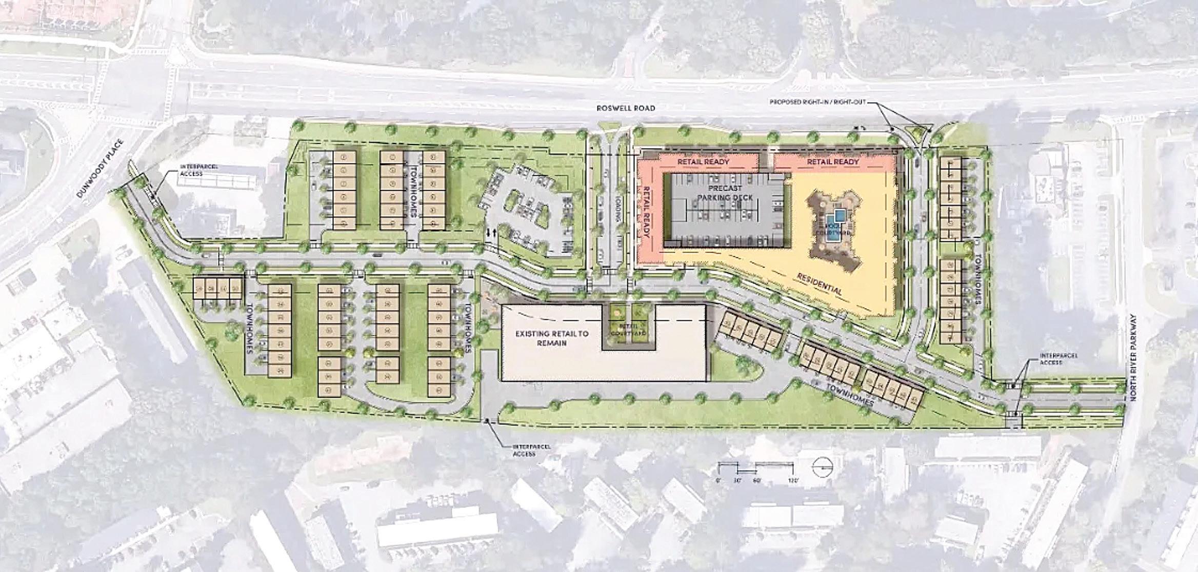 The property would be accessed from Dunwoody Place and Roswell Road with right in, right-out access, and North River Parkway with full access. The Georgia Department of Transportation already has plans for improvements to Roswell Road that would include pedestrian improvements and a traffic signal at North River Parkway, he said.