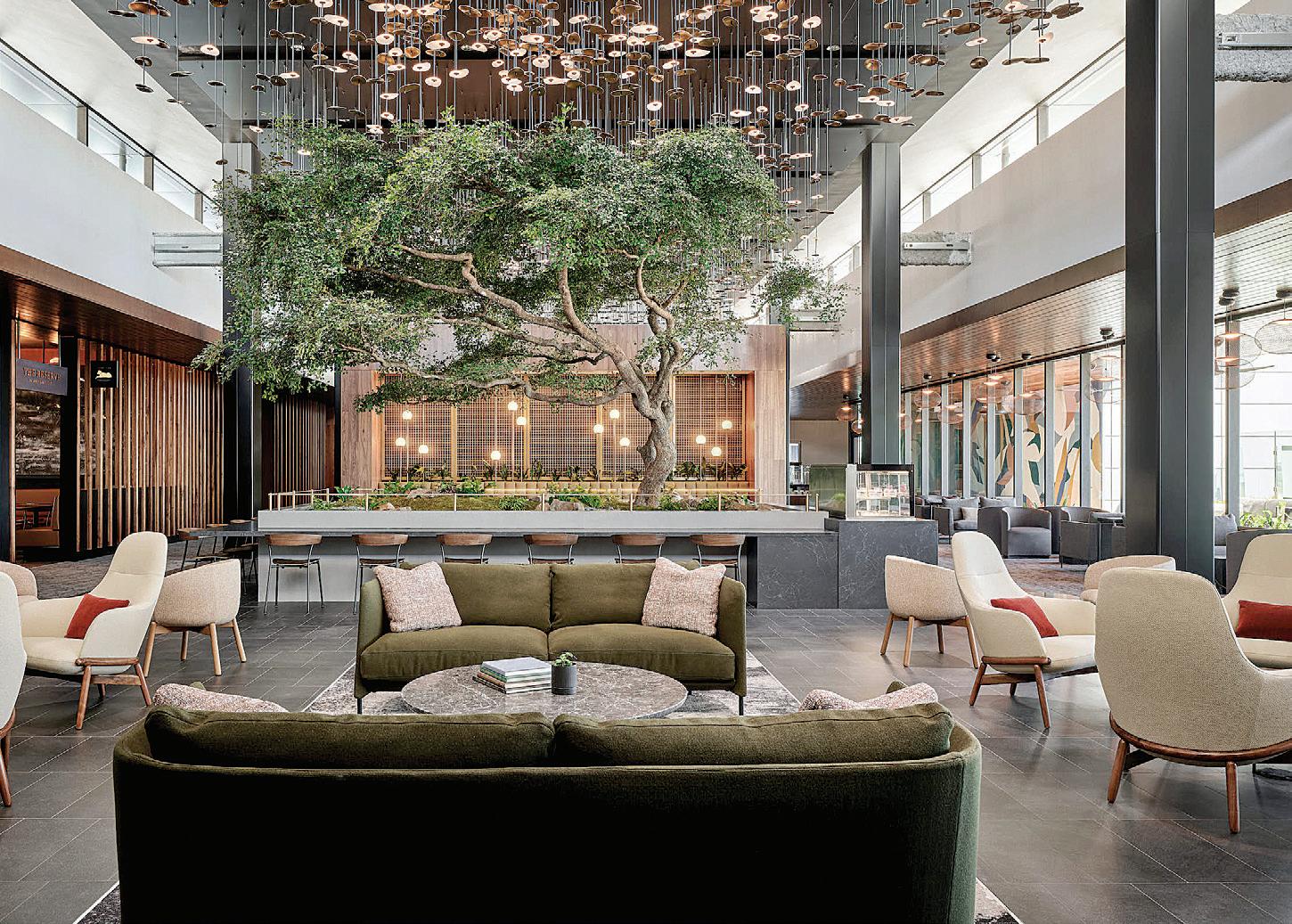 The lounge’s design is inspired by Atlanta’s reputation as “the city in the forest” and features a 50-year-old olive tree and a 3,850-square-foot custom light sculpture that represents a forest canopy.