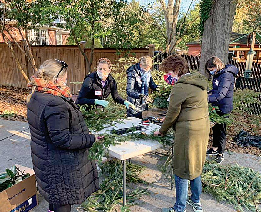 Members of the Garden Hills Garden Club assemble mailbox decorations.