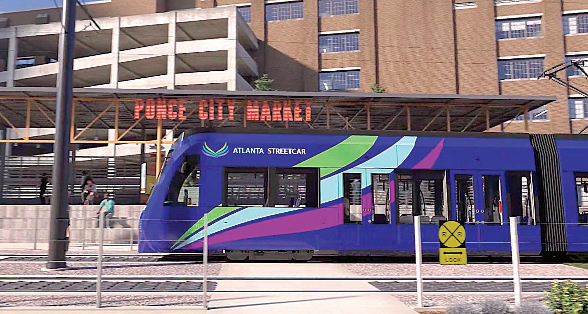 A rendering of the Atlanta Streetcar outside Ponce City Market. (Courtesy ABI) Mayor Andre Dickens gives his 2024 State of the City address. (Courtesy City of Atlanta)