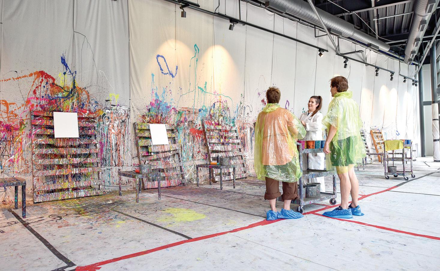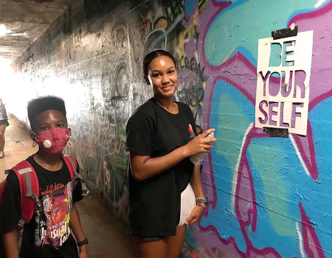 paint, challenges and a map. Freshman Caden Jenkins, left, and sophomore Jayla N’diaye tag Krog Tunnel with a core school value, “Be Yourself.”