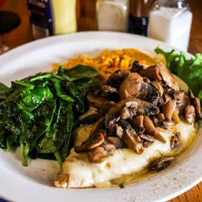 Succulent turkey breast is slow roasted, sliced, and served over our homemade dressing and covered in pan gravy, with all the fixings.