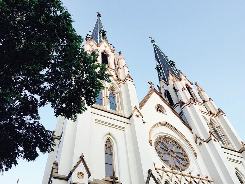 Before I left, I also wanted to see inside one of Savannah’s most beautiful buildings, the 19th-century neo-gothic Cathedral Basilica of St. John the Baptist (savannahcathedral. org). Located on Lafayette Square, its twin spires are visible on the city skyline, and you can hear its bells ringing out over the historic district. I attended a surprisingly full Saturday evening mass and had the chance to look around the cathedral.