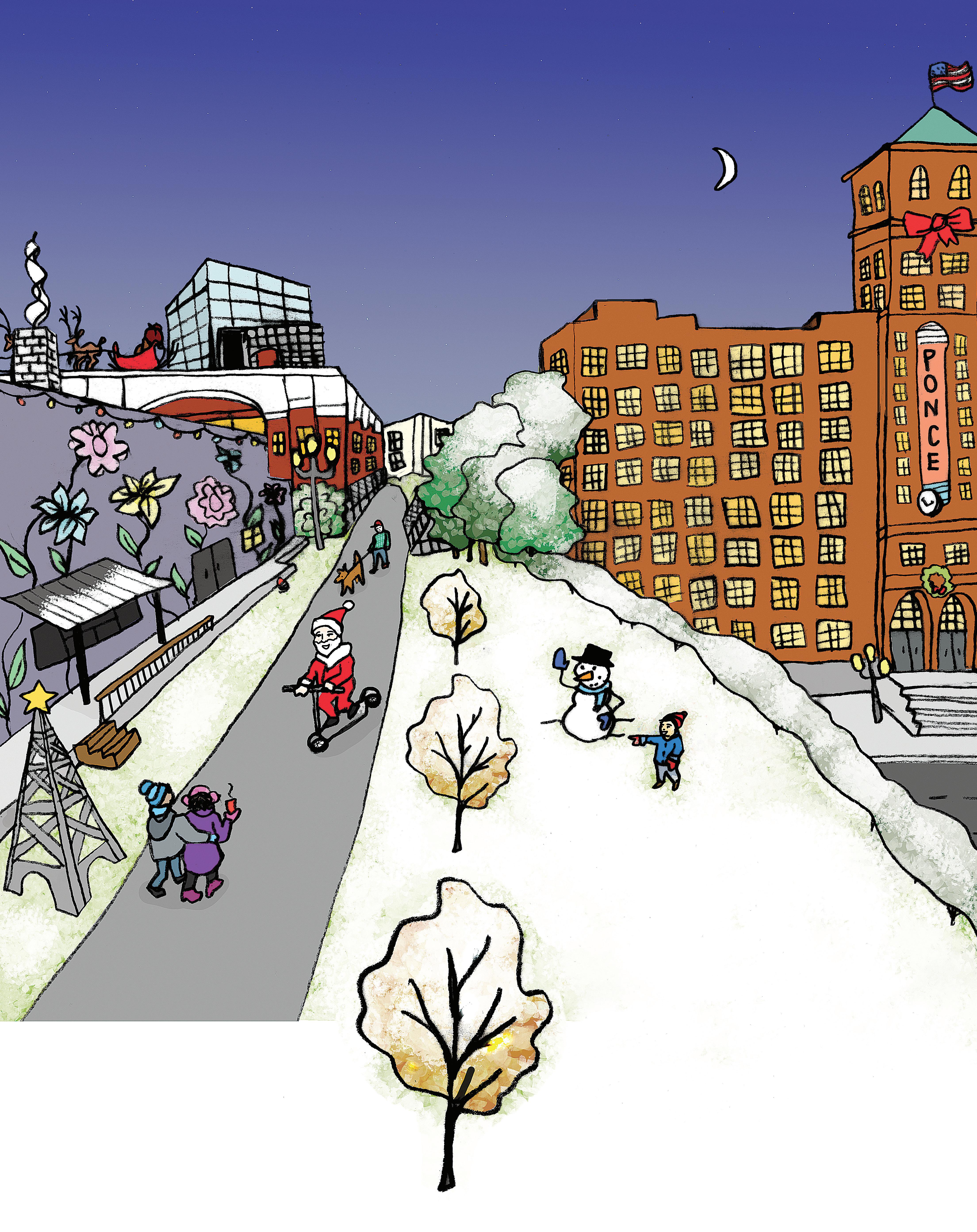 Photographer and artist Isadora Pennington makes a special return to INtown for the holidays with her colorful, whimsical illustration “Holiday on the BeltLine.” Ponce City Market, Ford Factory Lofts, 725 Ponce and Paris on Ponce are visible, along with Santa riding a Bird scooter - naturally. We love it, Isadora! 8 40 34 42 38