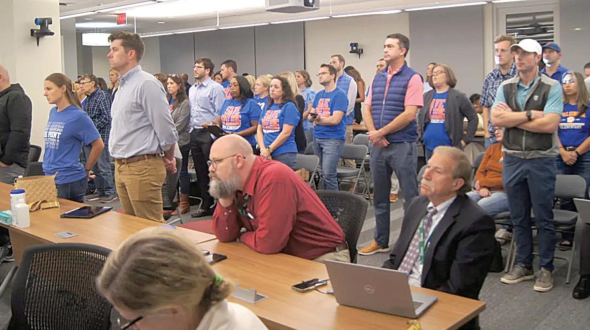 The school board held a work session with a public comment period on Nov. 12 at its North Learning Center in Sandy Springs. Board members heard from seven of the approximately 40 parents who attended the meeting, many wearing Save Spalding Drive Elementary shirts.