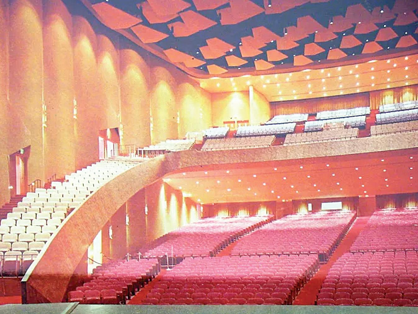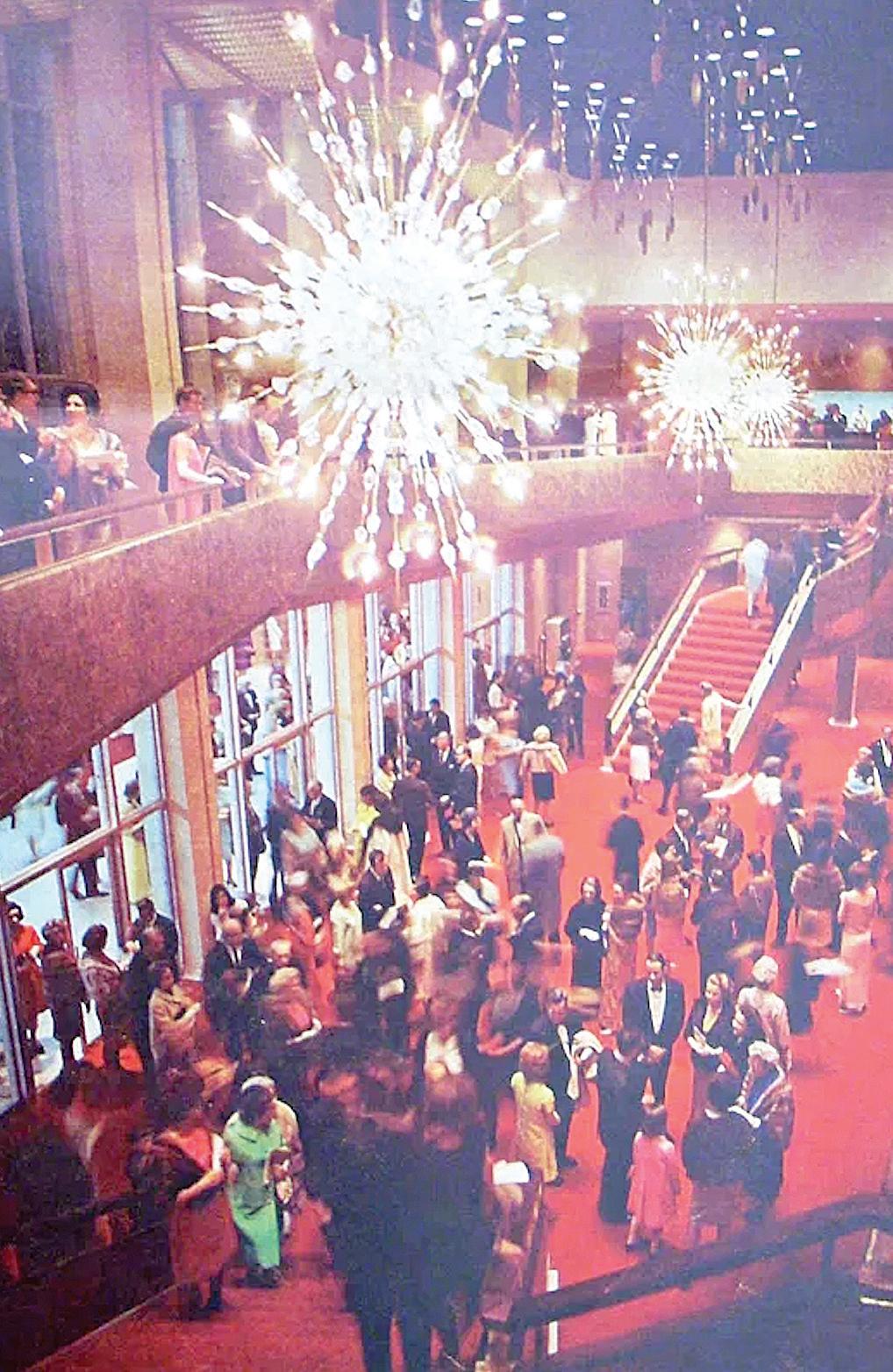 On March 4, 1968, the Atlanta Civic Center opened with a performance by the Atlanta Symphony Orchestra with conductor Robert Shaw. Musicians played on the largest stage in the Southeast. Attendees entered the theater through a hexagonal-shaped two-story foyer with two monumental staircases and Rambusch chandeliers hung from a deep blue ceiling. The architect’s use of metallic gold wallcovering and ceiling grilles, red carpeting, red and gold theatre seating, and walnut wood finishes elevated visitor experiences at the building.