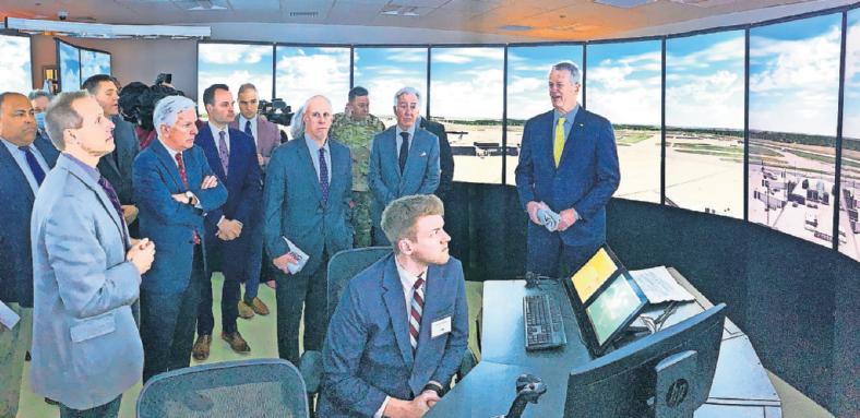 Officials including then-Gov. Charlie Baker, right, and U.S. Rep. Richard E. Neal, to Baker’s right, view the 360-degree air traffic control simulator during a ribbon-cutting ceremony, on April 26, 2022, for the University of Massachusetts Amherst Aviation Research and Training Center at Westover Airport in Chicopee. (DON TREEGER / THE REPUBLICAN FILE PHOTO)