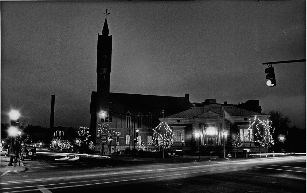 Left, cars buzz through Chicopee Center by the City Hall and the Chicopee Center Library as the Christmas lights sparkle in this photo from 1986. The city is moving ahead in 2023 with plans to redevelop the library. The old Center Library building has gone through planning and is ready for redevelopment as meeting space, potential office space for city commissions and departments and space for presentations. (DAVE ROBACK / THE REPUBLICAN FILE PHOTO)