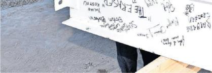 Left, former state Rep. Benjamin Swan, D-Springfield, left, gets set to attach the steel beam for the topping-off ceremony at the new Deberry-Swan School on Union Street in January 2022. Springfield Mayor Domenic J. Sarno is on the right. (DON TREEGER / THE REPUBLICAN FILE PHOTO)