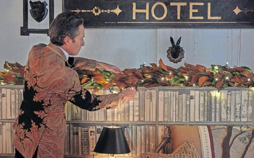 vintage artifacts with a flurry of magnolia leaves, flowers, lights and favorite serving dishes to create a warm, inviting atmosphere with a dash of nostalgia. To adorn his Christmas tree, Fulk repurposed vintage objects rather than using store-bought ornaments. For sparkle, he threaded hooks through individual pieces of crystal that had come loose from chandeliers. He did the same with vintage tassels and epaulets, and tied old ribbon intended for military uniforms around individual branches (all of which came from Tinsel Trading, a company founded in New York and now based in Berkeley, California). To finish off the tree, he added bunches of foraged pheasant feathers (which came from Jamali Garden in New York’s flower district).