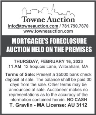 AUCTION Tuesday, February 14, 2023 12:00 PM-CUMMINGTON 54 Lilac Avenue sgl fam, 1,704 sf liv area, 1.25 ac lot, 7 rm, 3 bdrm, 1.5 bth, Hampshire: Bk 11766, Pg 315 2:00 PM-SPRINGFIELD 89 Sparrow Drive sgl fam, 1,470 sf liv area, 0.25 ac lot, 7 rm, 4 bdrm, 1.5 bth, Hampden: Bk 15761, Pg 166 TERMS: Cashier’s or certified check in the sum of $5,000.00 as a deposit must be shown at the time and place of the sale in order to qualify as a bidder. NO CASH No personal checks will be accepted. Cashier/certified checks should be made out to whomever is going to bid at the auction. The balance to be paid within thirty (30) days at the law offices of Korde & Associates, P.C. 900 Chelmsford Street, Suite 3102, Lowell, MA 01851, Attorney for the Mortgagee. Auctioneer makes no representation as to the accuracy of the information contained herein. RUG AUCTION FRI, FEB. 17, AT 6 PM Large rug auction consisting of 200 oriental rugs. Many room size runners, mats and others. If you need a rug for your home or office, this is your best opportunity to purchase one at auction prices. PREVIEW DAY OF SALE 8AM - 6PM WWW.DOUGLASAUCTIONEERS.COM
