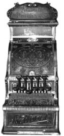 Current prices are recorded from antiques shows, flea markets, sales and auctions throughout the United States. Prices vary in different locations because of local economic conditions. Coin-operated, gum, Select-O-Matic, Package Gum, 5 cents, yellow ground, multicolor graphics, nickel plate base, 20 inches, $70. Royal Doulton, vase, shaded brown, abstract flowers around shoulder, flared lip, horizontal ridges around base, slightly flared foot, stoneware, marked, 11 1/2 inches, $75. Stoneware, bottle, dark brown glaze, impressed lettering, “P” in diamond, Pfannenbecker, Paterson, N.J., 10 1/2 inches, $100. Capo-di-monte, urn, dome cover, figural side handles, fauns seated on animal mask, grapevines, multicolor, gilt trim, square base, 17 inches, $120. Rug, penny, three dots on each disc, multicolor, six-sided, fringe border, table, 19th century, 30 x 52 inches, $125. Glass-contemporary, vase, iridescent, purple, blue swirl, shoulders, flared lip, signed, dated, Charles Lotton, 1973, 6 1/2 inches, $315. Furniture, chair, Chippendale, walnut, crest rail, pierced splat, scallop shells, acanthus front legs, ball-andclaw feet, Philadelphia, late 1700s, 40 inches, $560. Toy, dollhouse furniture, bed, Sheraton, bird’s-eye maple, figured headboard and footboard, turned posts, brass casters, four parts, mid 1800s, 23 x 18 x 26 inches, $750.