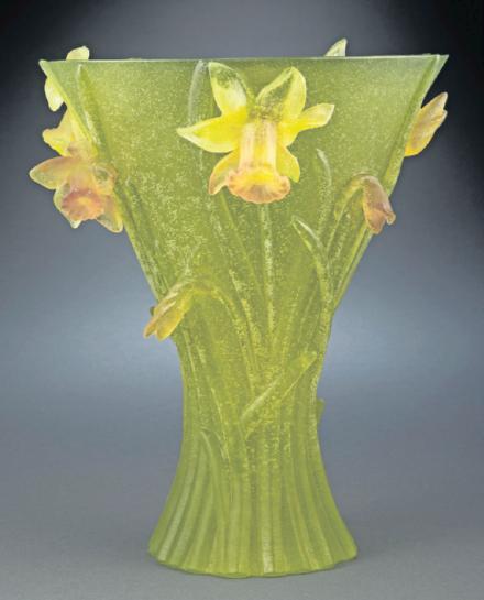 Glassworks like Daum made pate-de-verre pieces with three-dimensional flowers. They are often valuable today. This Daum vase made to look like a bunch of daffodils sold for $2,125 at Heritage Auctions.