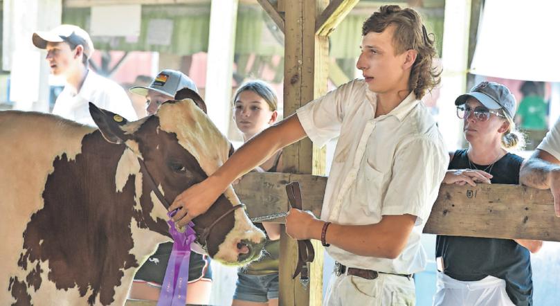 Jared Small, of Huntington, attaches the Grand Prize Championship ribbon to his dairy cow during the Dam & Daughter Class dairy cow competition at a past Westfield Fair.