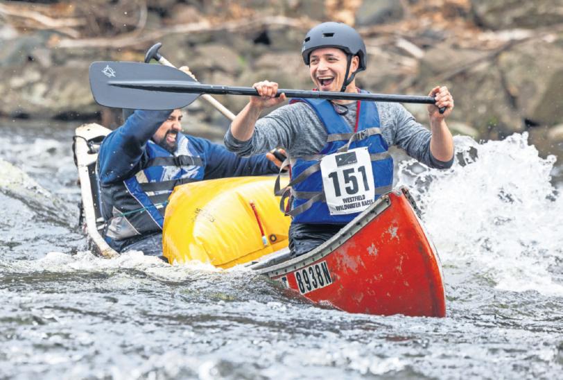 Andrew Cappola (151) and his fellow paddler are all smiles after successfully navigating the Hill and Dale Rapids during the 2023 Westfield River Wildwater Races. The 69th annual races take place on Saturday. (HOANG