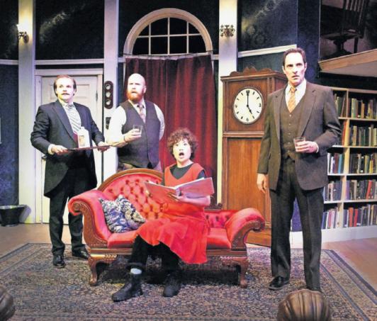 Actors (from left) Josh Karam, Shaun O’Keefe, Mariko Iwasa and Jack Grigoli are shown in a scene from “The Play That Goes Wrong,” being staged at West Springfield’s Majestic Theater through June 2. (KAIT RANKINS PHOTO)