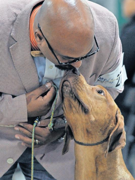 Professional dog handler Arvind DeBragance, of Gainesville, Florida, receives a kiss from Prince, as the two wait for the show class to begin during a past Ox Ridge Kennel Club Show at the Eastern States Exposition. The show returns Friday to the Better Living Center. (FREDERICK GORE PHOTO, FILE)
