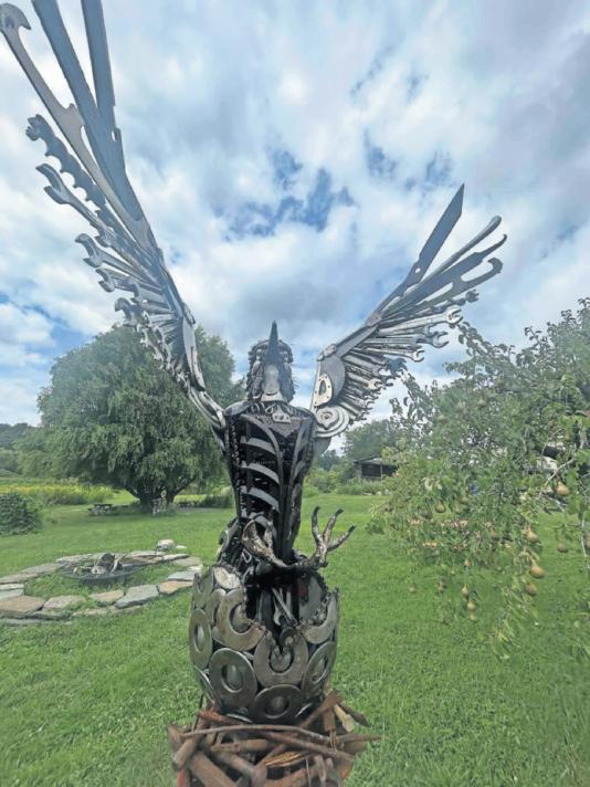 Park Hill Orchard in Easthampton will offer a special musical evening on Saturday at 6 p.m. People will be led in small groups through the historic orchard, pausing at musical stations to experience short instrumental and choral performances along the way. The total walking distance is 1/3 mile. Above, one of many sculptures installed on the grounds of Park Hill Orchard. (ASHLEY POTTER / THE REPUBLICAN)