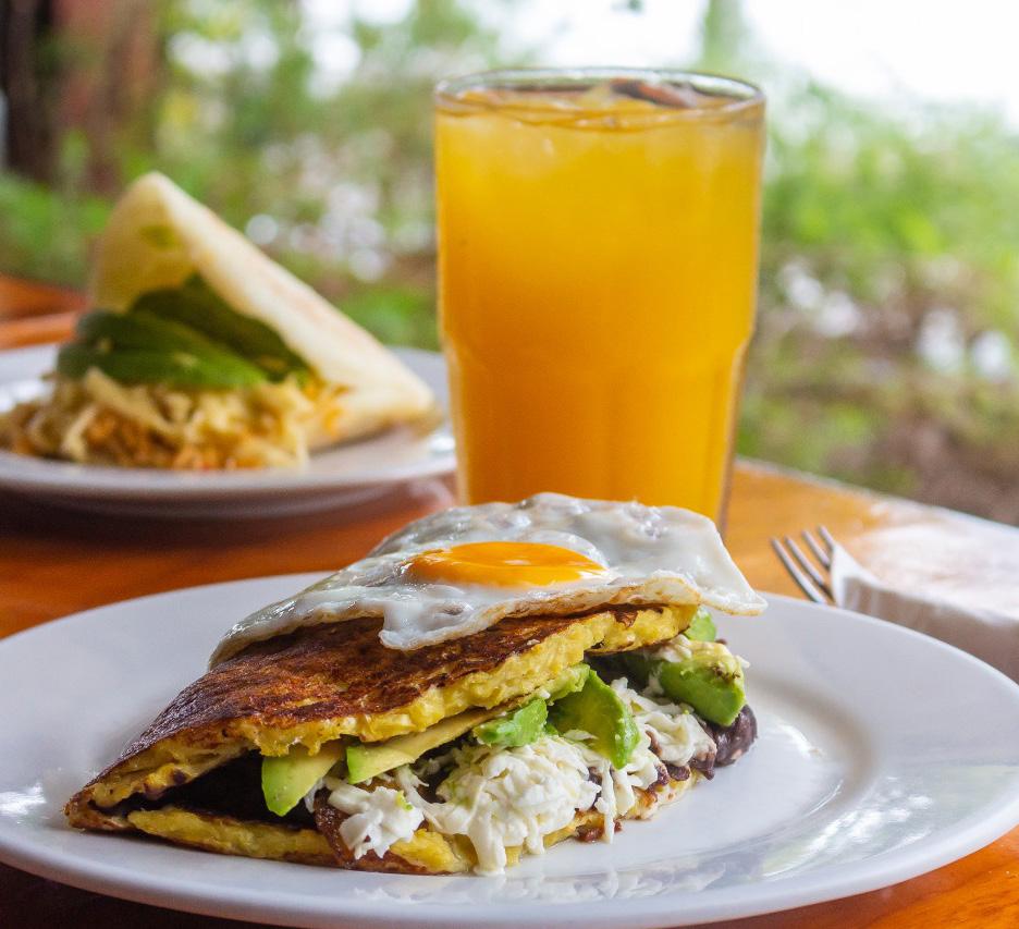 Una rica especie de panqueca, hecha de elote tierno, sin gluten, ni huevos, ni lácteos. Rellena de frijoles negros, queso fresco, tajadas (plátano macho maduro) y aguacate. Se puede agregar un huevo estrellado.