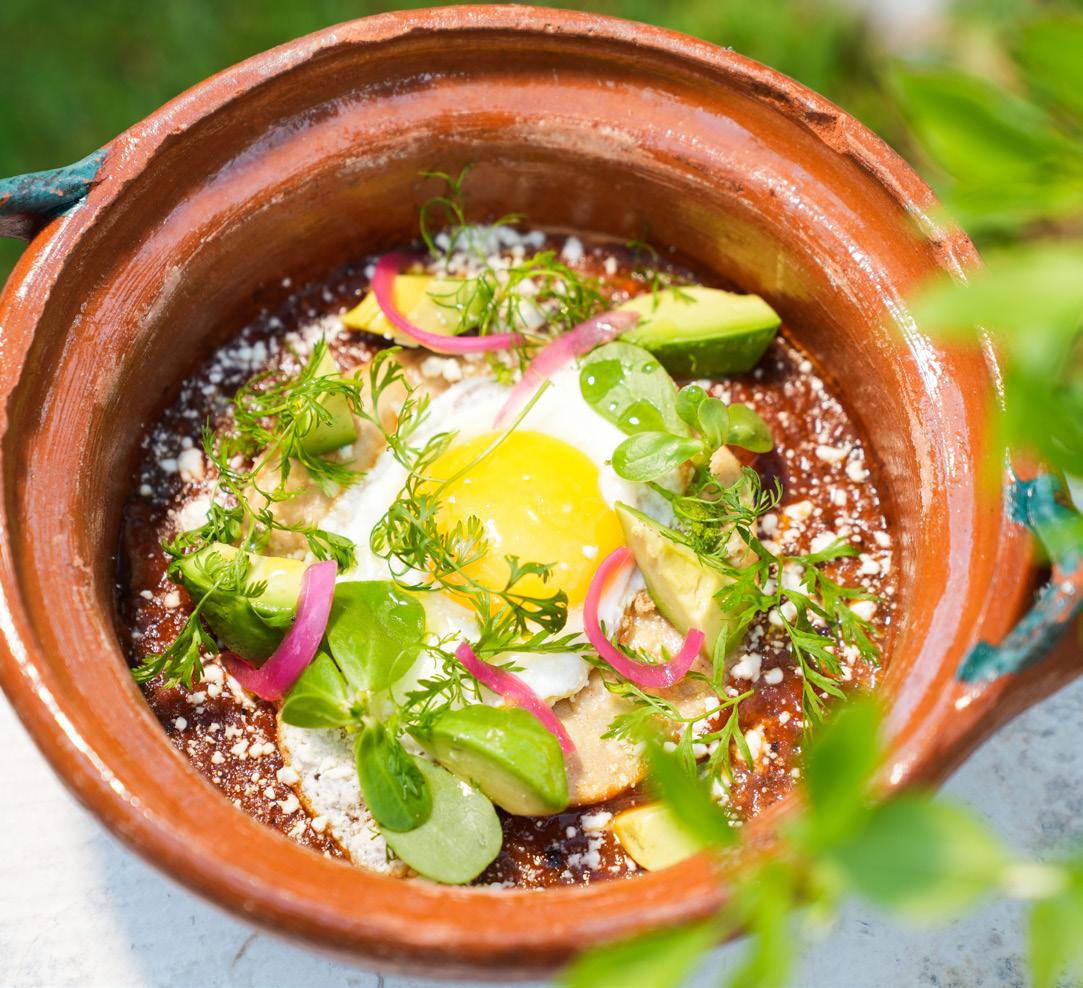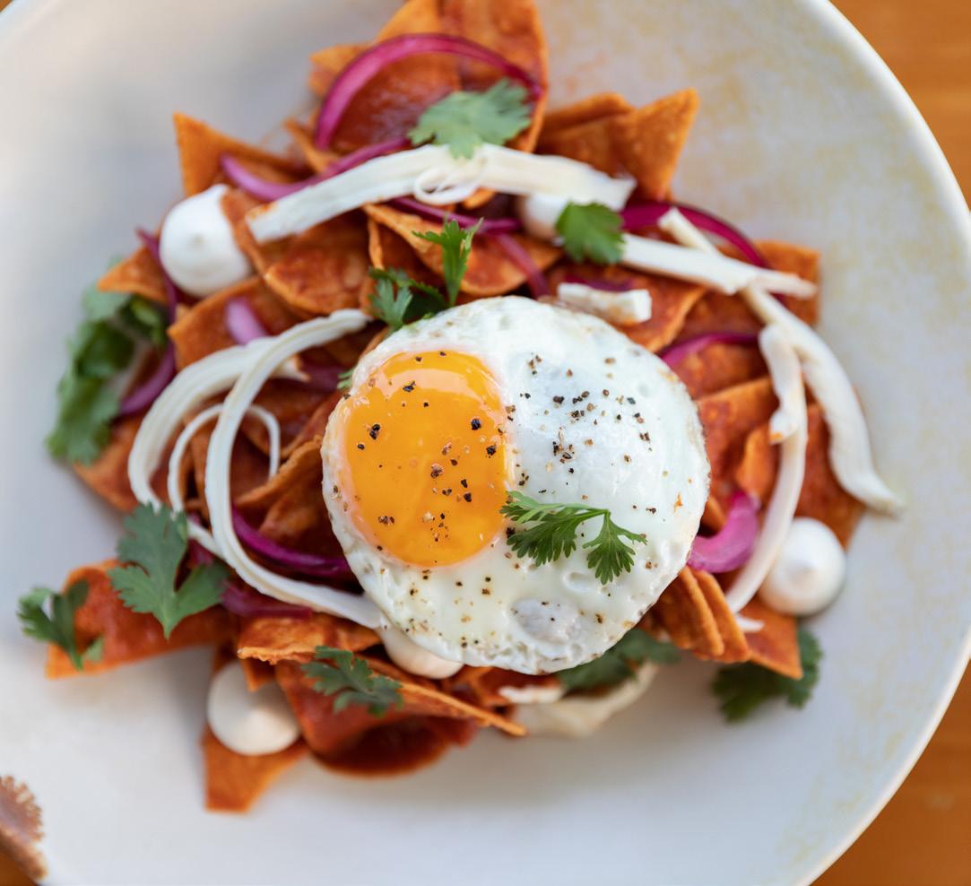 Chilaquiles rojos con pollo Crocante de tortilla, salteado en salsa roja ahumada, queso Cotija, cebolla marinada en cítricos y hierbas de olor, crema acidificada, aguacate espolvoreado con ceniza de chiles, tortilla y pimientos. Terminado con hojas de cilantro y pollo marinado con el sazón de la casa.