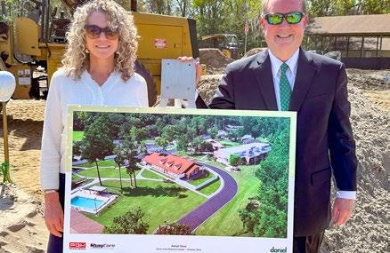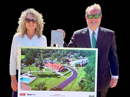 Daniel CEO Lesley Wells and Chairman of the Board of Trustees Judge Timothy Corrigan pose beside a rendering of the new cottage at the March 11 groundbreaking ceremony.