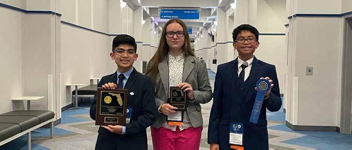 Marco Chua, Viktoriia Galushchak and Joshua Inocencio after the SSEF awards ceremonies on April 6 in Lakeland.