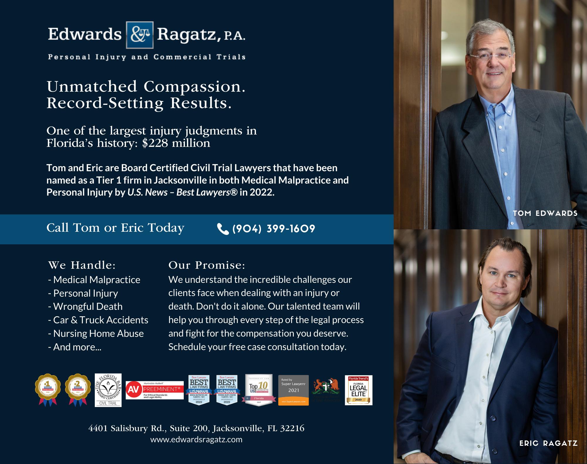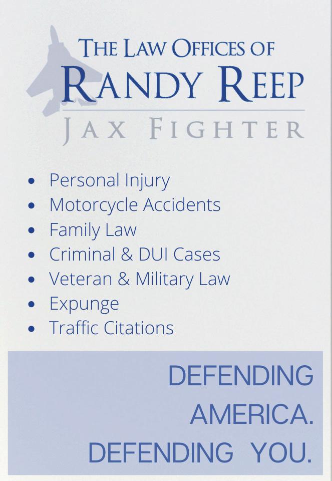 LET US HELP!! We’re a multi-disciplinary practice with a focus on treating musculoskeletal pain and injury. PROVIDING: • Chiropractic • Spinal decompression • Interventional pain management services • Medical care and weight loss • Cold laser for acute injuries • Laser body sculpting (InvisaRed™ and Zerona™) • Massage therapy Most insurance accepted. Discount plans available for self-pay. Care Credit accepted. Paul Busse, MD Arkam Rehman, MD Christopher Renne, DC Richard Woody, DC Marialena Martir, LMT 2570 Atlantic Blvd. • Jacksonville, FL 32207 www.activechirocenter.com Call to schedule an appointment today! 904-398-4860 Pain? Sports-Related Injury? Auto Accident? Se-habla Español. Podemos ayudarte hoy DEFENDING AMERICA. DEFENDING YOU. 6720 Atlantic Boulevard • Jacksonville, FL 32211 (904) 830-4444 • www.reeplaw.com Hablamos Español Falamos Português Randy Reep Attorney at Law