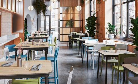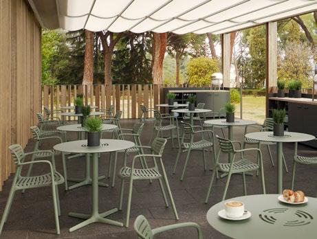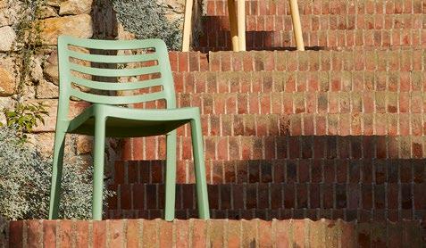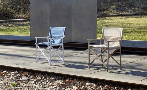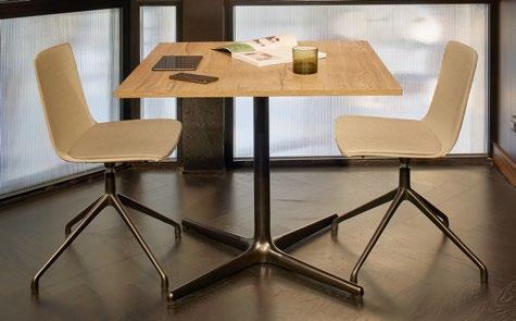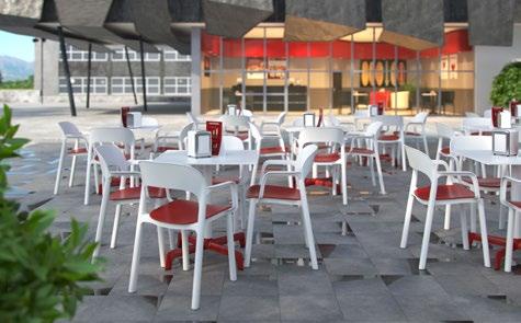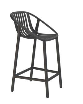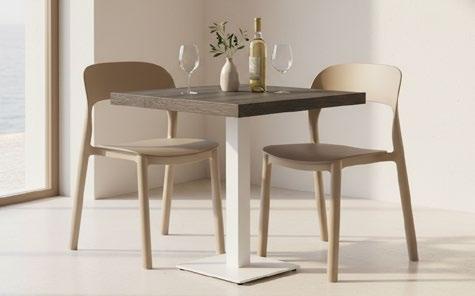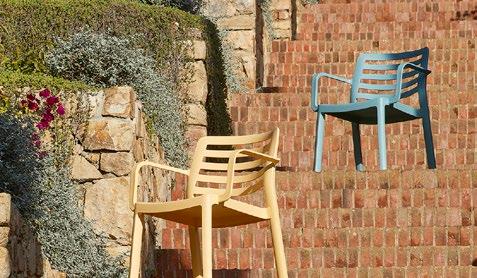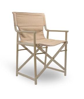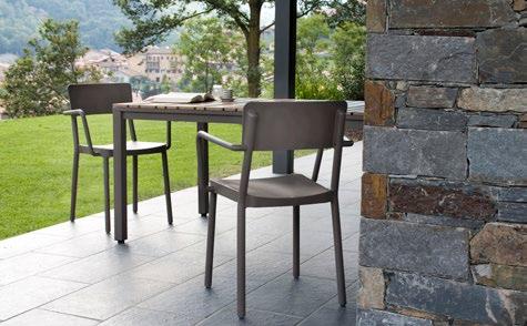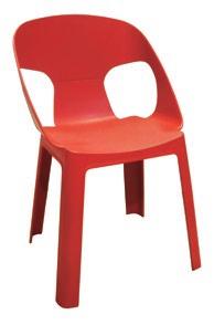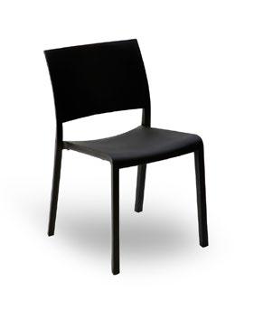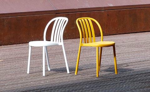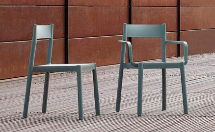 Chaise empilable en aluminium laqué et mousse injectée tapissée. Disponible en toile standard et – sur commande – en toile non-feu CRIB-5. Structure or
