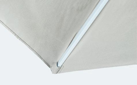 3x3 m parasol. double pulley. Onepiece aluminum mast and 8 aluminum ribs. Fabric weight 300 g/m2. Polyester. Aluminum with stainless steel effect. Does not include foot.
