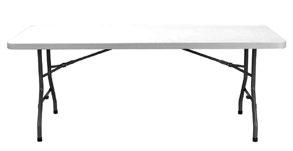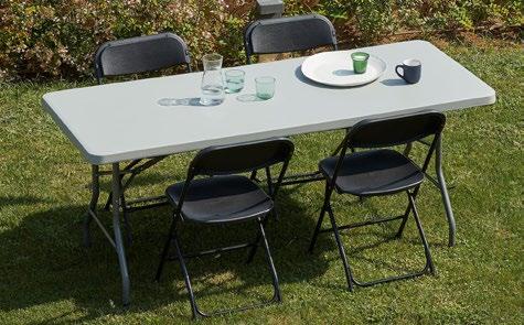 Table pliante avec structure en acier peint et plateau en polyéthylène haute densité. Plateau monobloc étanche. Poids net 14 kg. Avec traverses ergonomiques et système d’assemblage.