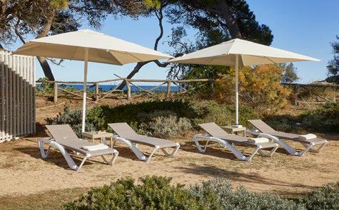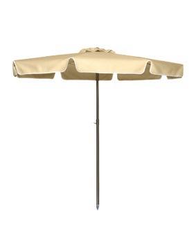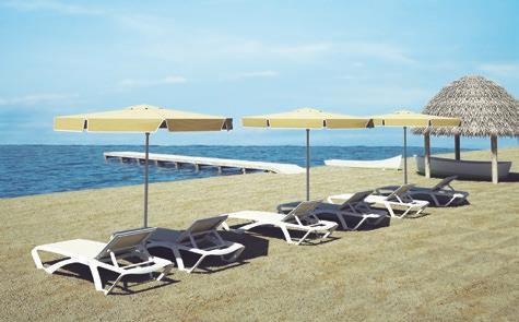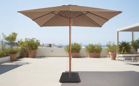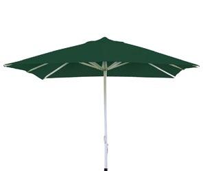 Parasol cuadrado 3 x 3 m con mecanismo de apertura sin esfuerzo y sin cuerda. Incorpora auto bloqueo. Mástil de aluminio de una sola pieza de ø60mm. Tela de poliéster tintado en masa.