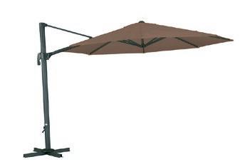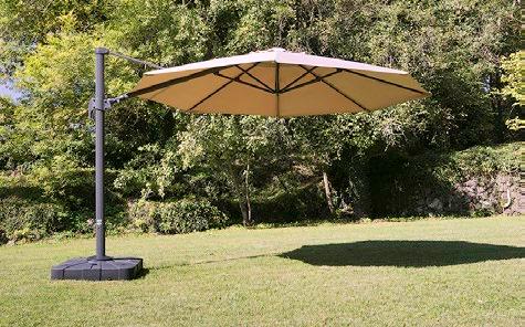 Parasol de pie lateral. Mástil de aluminio con apertura por manivela,. Tela de poliéster de 250 g/m2, sin flap, con chimenea. Función de inclinación de la cubierta a derecha e izquierda. Giro con rotación de 360º. No incluye pie.