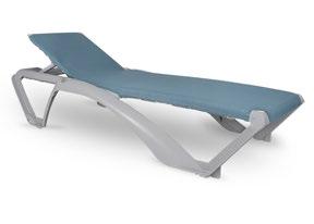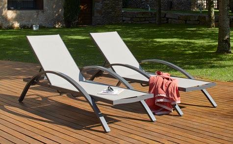 Tumbona apilable de aluminio pintado por pulverización en gris oscuro con textilene gris claro. Reclinable en 6 posiciones.