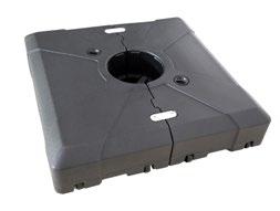 Pie apto para parasoles A2 y LA2. Cuando está relleno de arena o agua su peso es de 120 kg o 150 kg. Para cambiar el pie de ubicación con el parasol instalado se recomienda no realizar la maniobra de forma brusca para evitar que las ruedas se rompan.