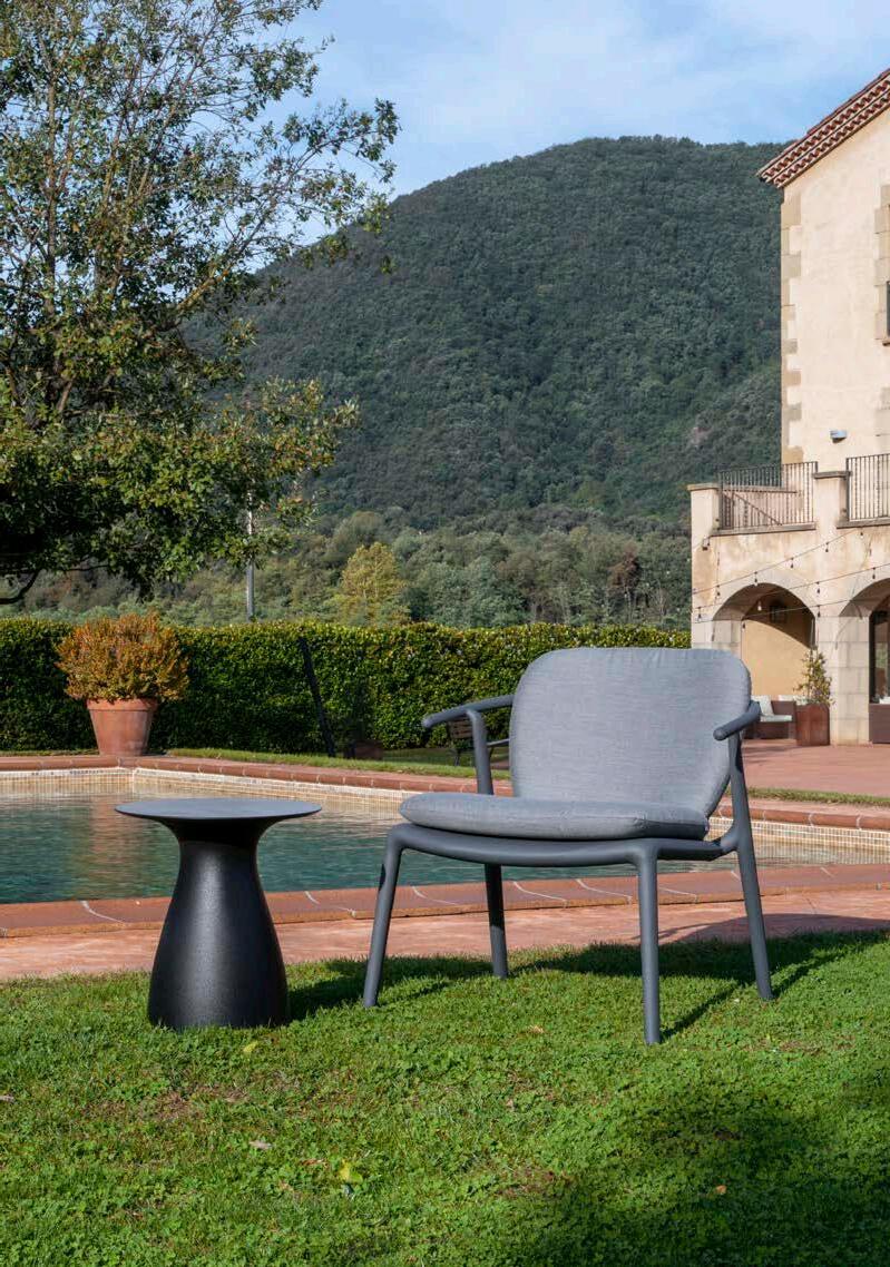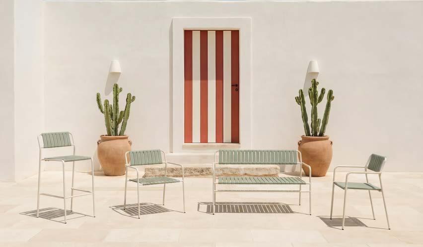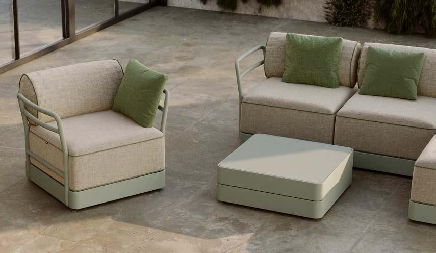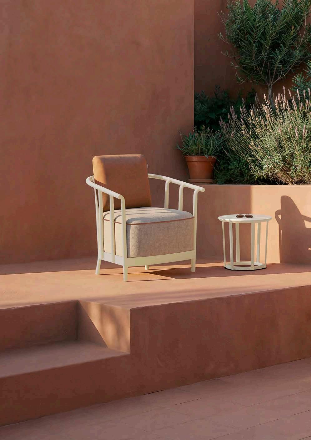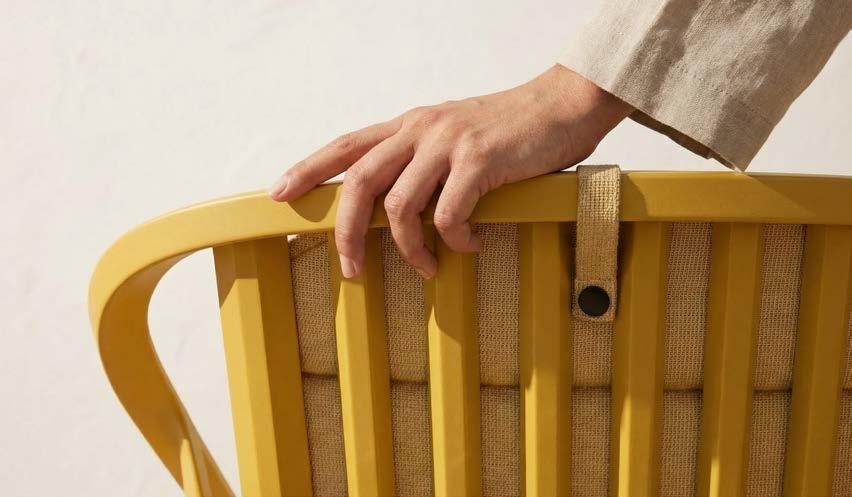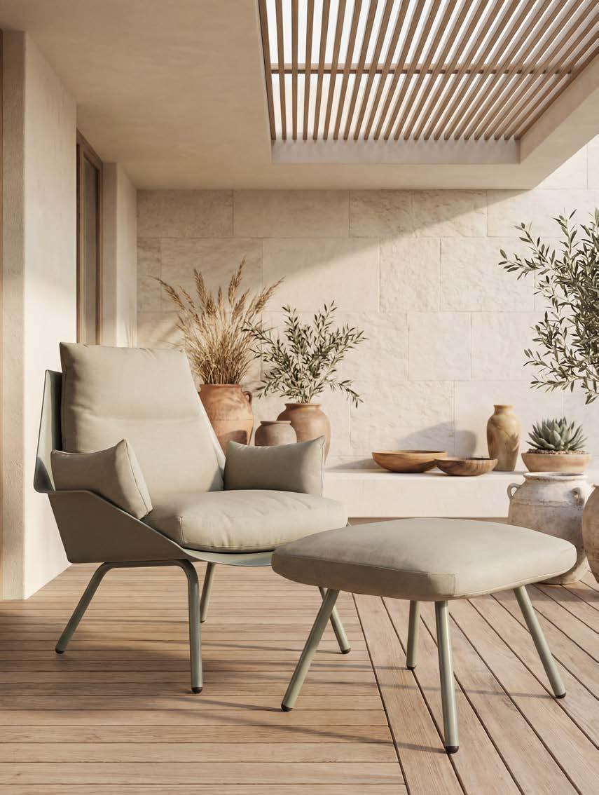 Con Brisa, los espacios exteriores se transforman en lugares para compartir, descansar o trabajar. Una colección sostenible: piezas en material reciclado, espuma biobasada y tejidos outdoor de altas prestaciones, rematados con un elegante bordón.