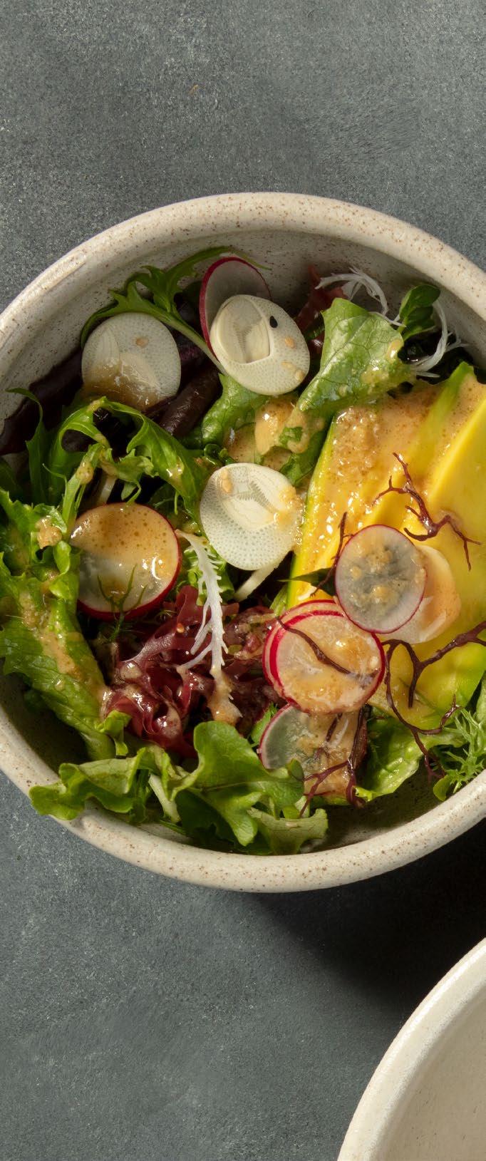 Mezcla de lechugas orgánicas, aguacate, palmito del Putumayo, ajonjolí, rábano y algas, con vinagreta de jengibre.