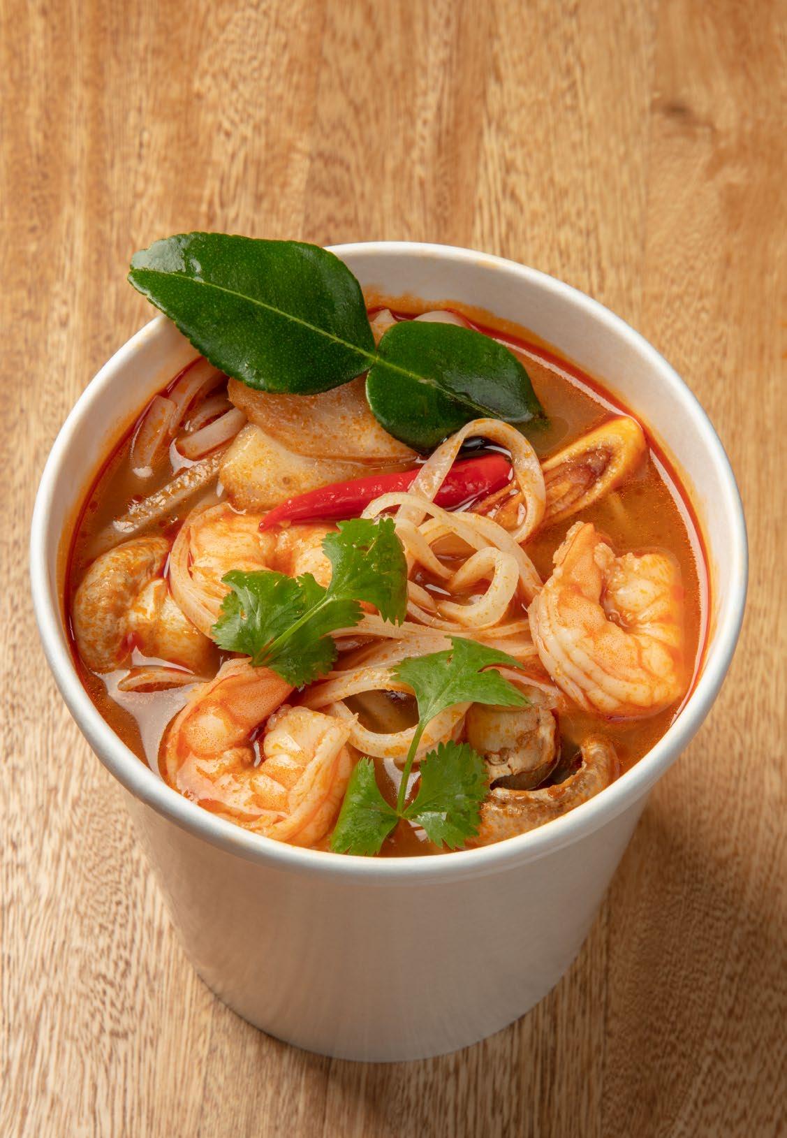 Consomédemar,orellanas, limonaria,tamarindo,hojas delimónkaffir,cilantro, galanga,chileynam-pla. Servidaconpastadearroz.